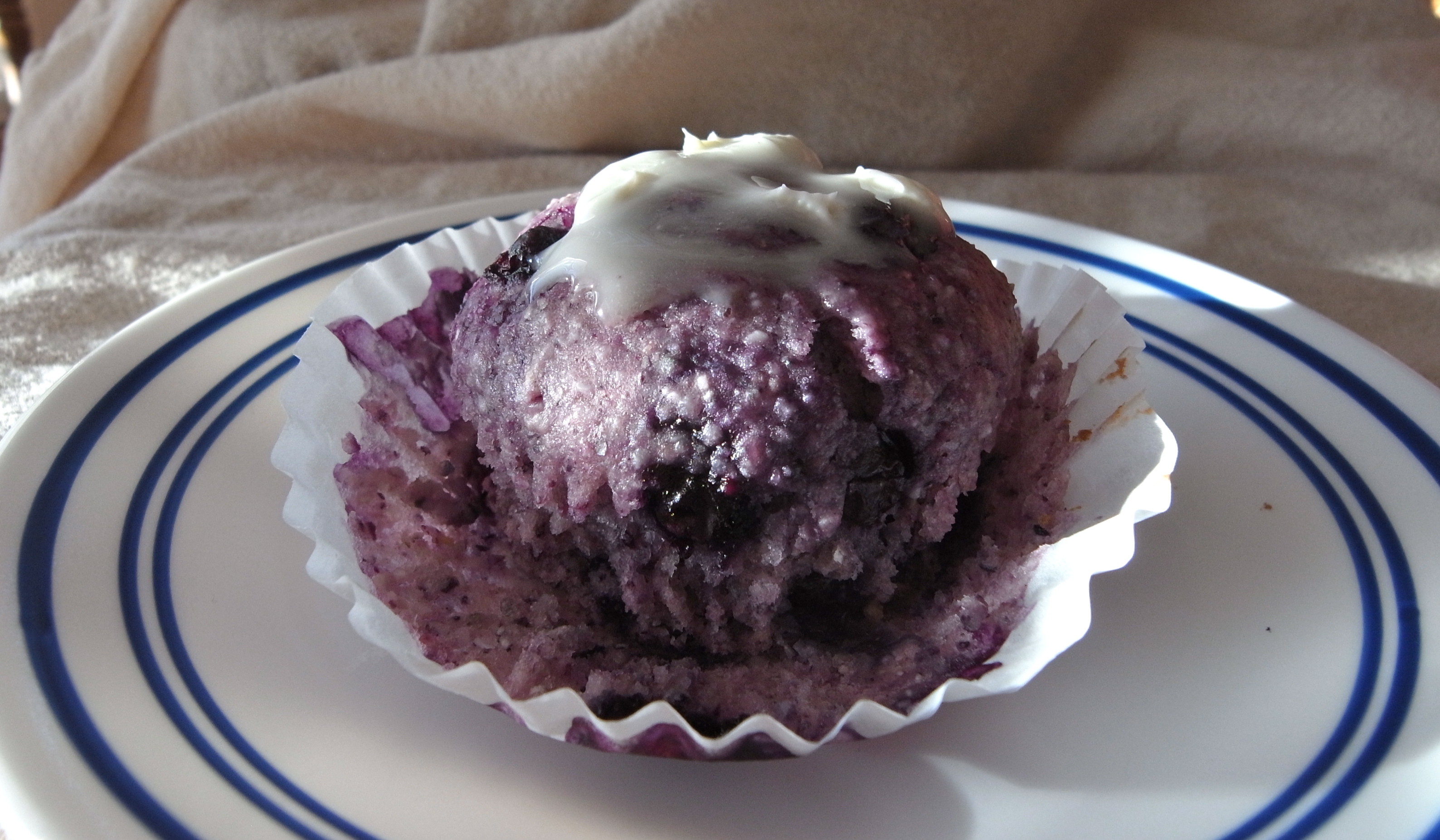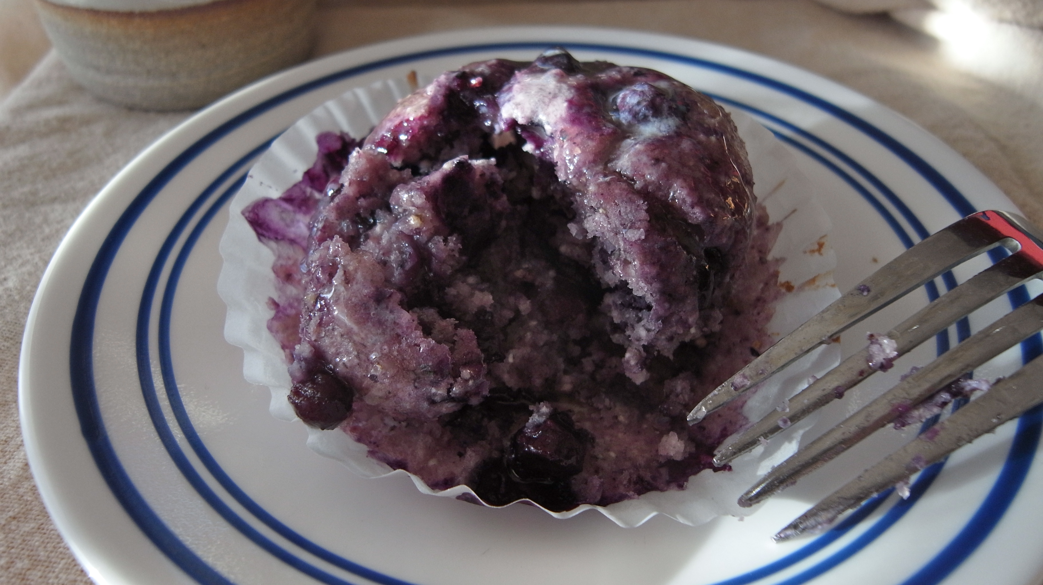 Mix all of the dry ingredients in a large bowl, set aside. Whisk all of the wet ingredients except blueberries in a medium bowl. Pour the wet ingredients into the dry and mix just combined – do not over mix. Spoon batter into muffin tins about 2/3 -3/4 full. Bake for 15-20 minutes or until tooth pick inserted into the center comes out clean.
