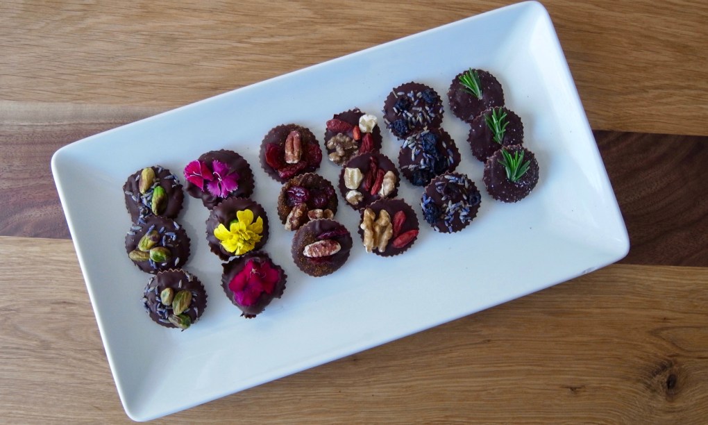 Have you heard about the Three Pleasures – a dessert challenge that circled in 2016 challenging chefs to create healthier dessert options using the Three Pleasures – dark chocolate, fruit, and nuts? For a cooking demo I’m working on we’re using these three ingredients as a healthier dessert option for diabetics – and if you just want to be healthier in general while satisfying your sweet tooth. While thinking of dried fruit and nut options for a chocolate bark I decided to get a little crazy and thought – what if I add herbs?!